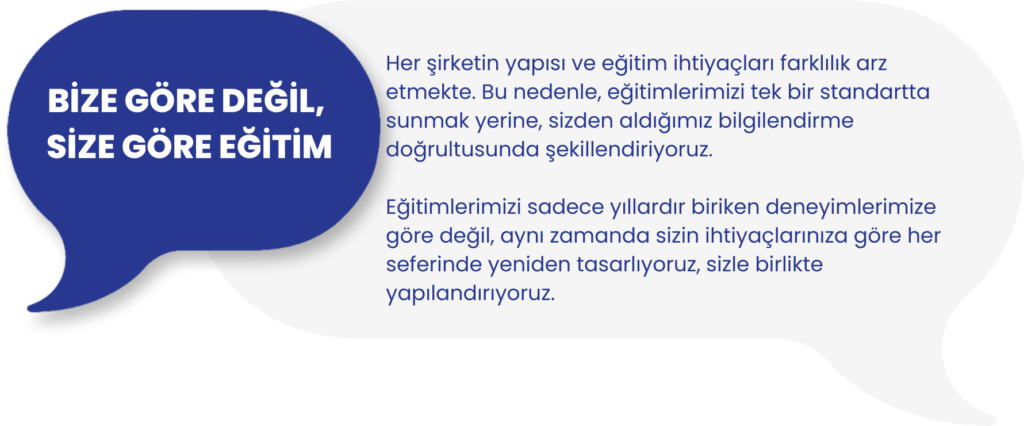 Her şirketin yapısı ve eğitim ihtiyaçları farklılık arz etmekte. Bu nedenle, eğitimlerimizi tek bir standartta sunmak yerine, sizden aldığımız bilgilendirme doğrultusunda şekillendiriyoruz.